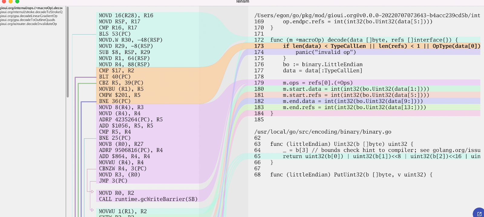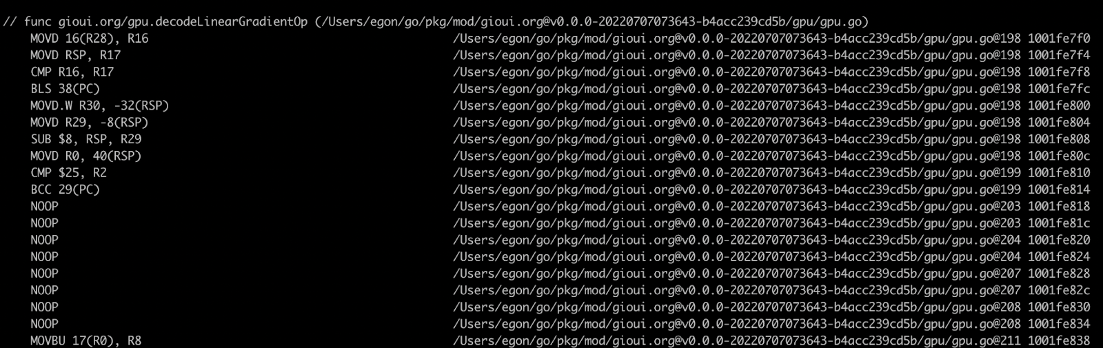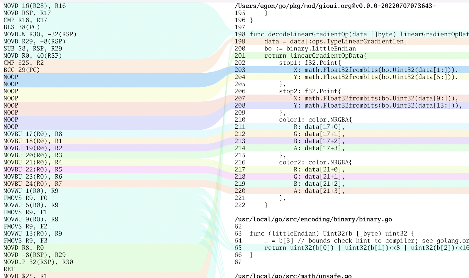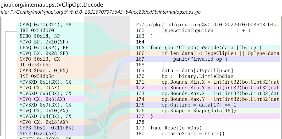 My story starts on a weekend when I was doing a bunch of tiny optimizations to the Gio UI project. There are ways to view the assembly; one is to use go tool objdump -s funcname from the command line. However, it's rather difficult to see how the source code and assembly are related.