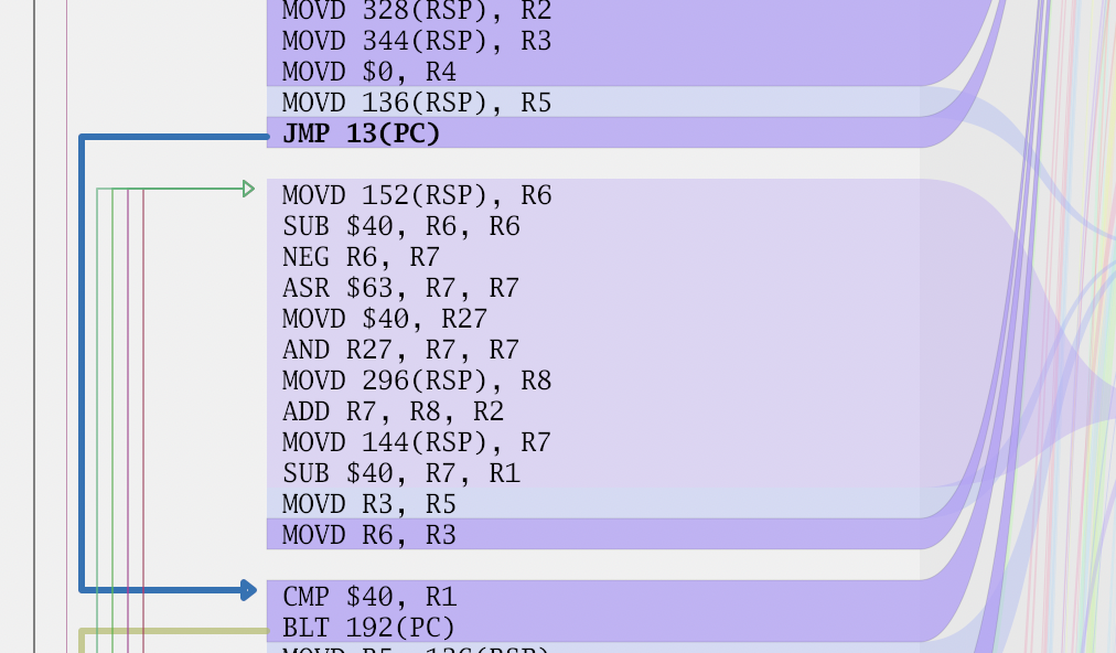 The next thing I wanted to visualize was drawing jumps in the code. They are important from a performance perspective. It's relatively common for disassemblers to draw an arrow from the jump location to the destination. This brings up two problems, detecting the jumps, and figuring out how to draw the lines.